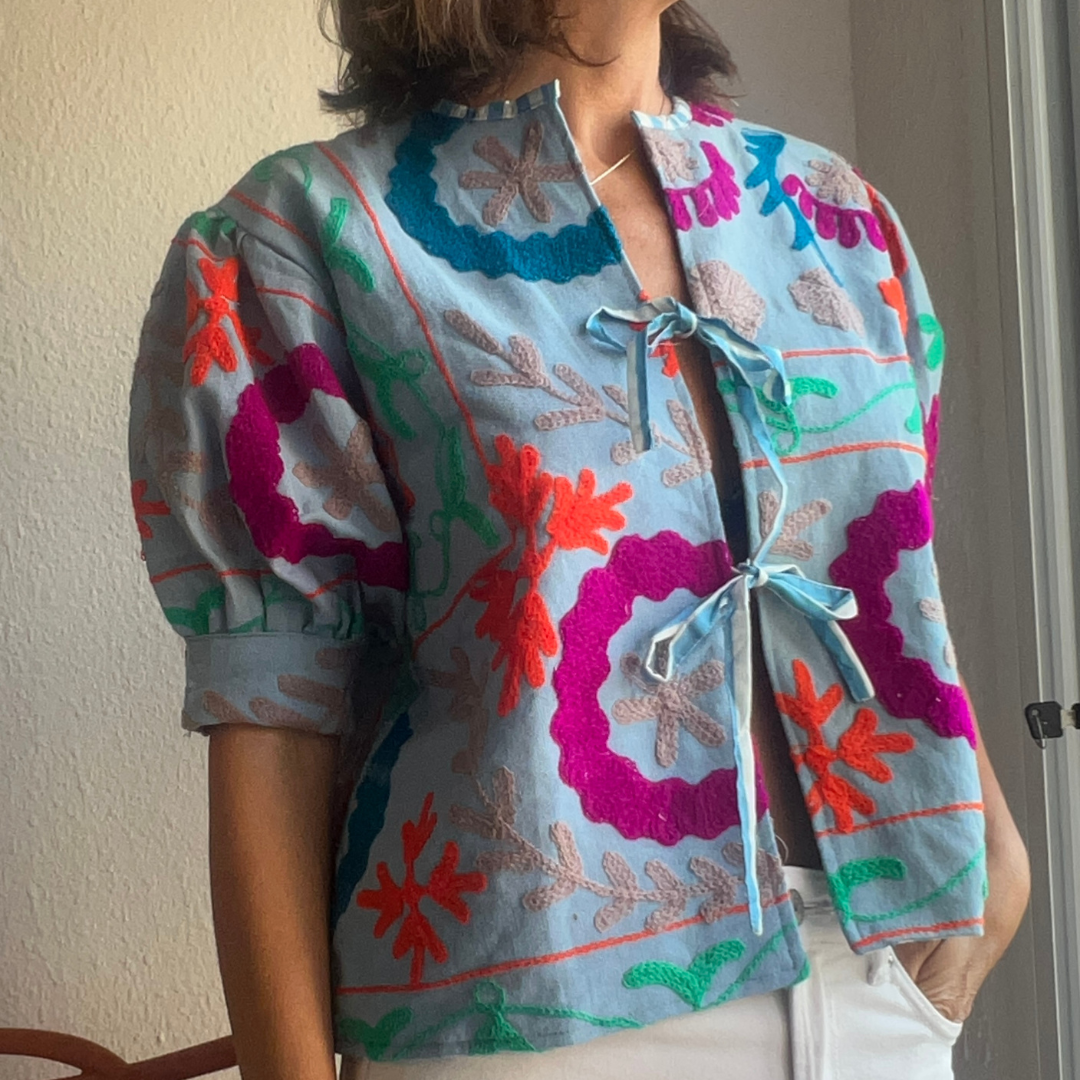 CHAQUETA: corta, manga corta globo, posee dos lazos por delante para atar.